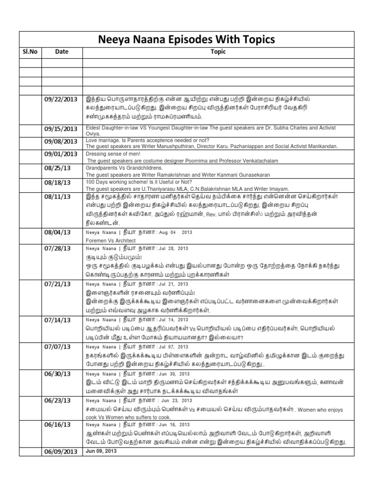 Neeya Naana: All Episodes - Trakt Neeya? Naana? (English: You? or Me?) (Tamil: நீயா நானா) is a Tamil talk show on the regional television channel Vijay TV of STAR TV network.[1] It is currently one of the most popular Tamil talk show aired primarily in Tamil Nadu every Sunday at 9:30 PM - 11:00 PM. It brings together polarized sections of the society and allow them to debate on a topic that affects them the ... Neeya Naana - Episodes - IMDb What's on TV & Streaming Top 250 TV Shows Most Popular TV Shows Browse TV Shows by Genre TV News India TV Spotlight. ... Neeya Naana (2006- ) Episode List. Season: OR . Year: 2022. Add Image. S23, Ep226. 23 Jan. 2022 Male Subordinates or Female Boss? 0. Rate. 1. Rate. 2. Rate. 3. Rate. 4 ...