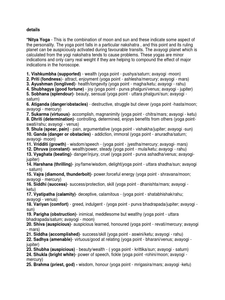 › articles › astrologyPersonality As Per 27 Nitya (Birth) Yogas in Vedic Astrology Dec 17, 2018 · Know Your Personality As Per Your Nitya Yoga. According to Hindu astrology, the behavior, traits and nature of an individual born on earth depends on the astrological spread or the position of stars at the time and date of a native’s birth, also known as Tithi (birth date).