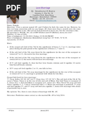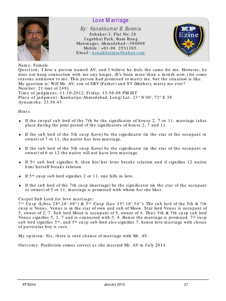 Love Marriage Kp Astrology [pnxkz2p3794v] - idoc.pub Love Marriage By: Kanakkumar B. Bosmia Sahakar-2, Flat No: 28 Jagabhai Park, Ram Baug Maninagar, Ahmedabad—380008 Mobile : +91-98 2531165. Email : [email protected] Name: Female Question: I love a person named AV, and I believe he feels the same for me. However, he does not keep connection with me any longer, (It's been more than a month now.) for some reasons unknown to me.